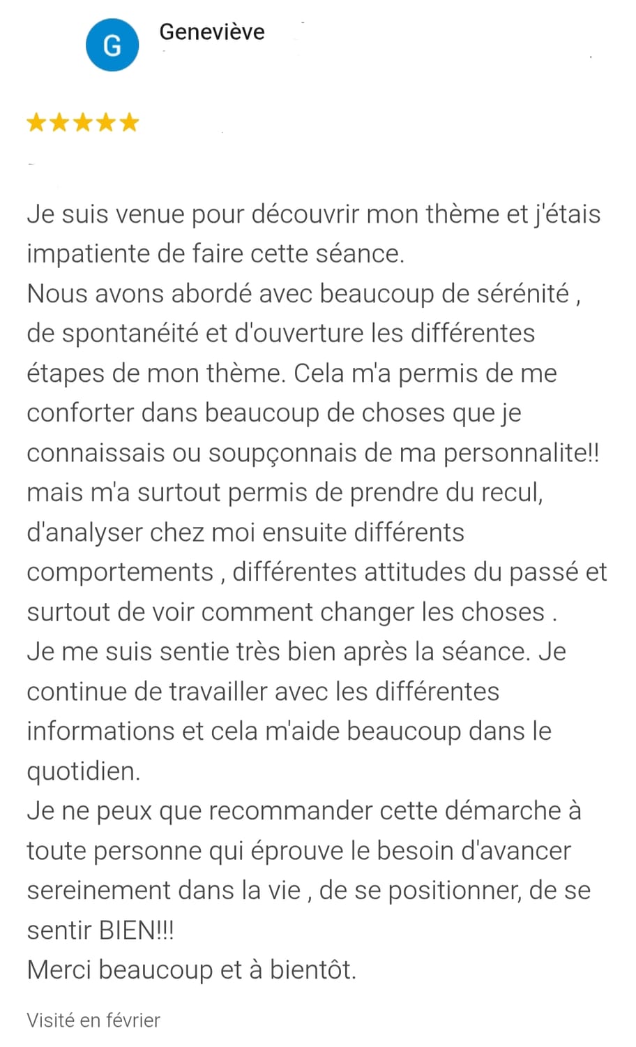 Lors de votre prise de rendez-vous, vous me transmettez toutes vos informations d'identité dont je vais avoir besoin pour étudier votre thème.